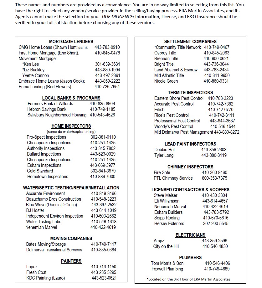 This Vendor List will be updated yearly, and vendors and contractors’ licenses and insurance will be confirmed. Discuss your individual needs and circumstances with your ERA agent for a personalized recommendation.